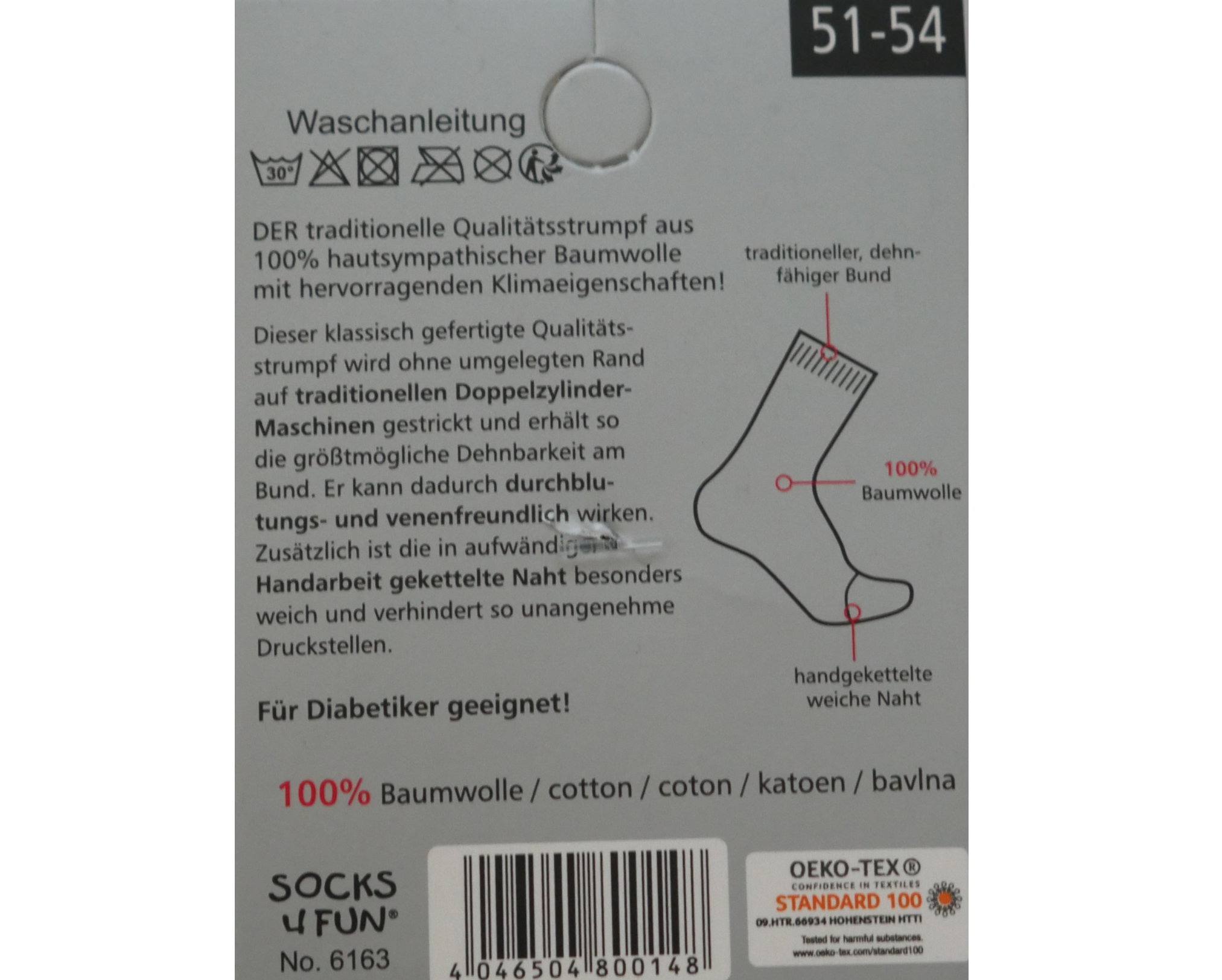 3 Paar Herren Socken Größe 51-54 Schwarz aus 100% Baumwolle mit traditionellen dehnfähigem Bund und handgekettelter weicher Naht. Dieser klassisch gefertigte Qualitätsstrumpf wird ohne umgelegten Rand auf traditionellen Doppelzylinder-Maschinen gestrickt und erhält so die größtmögliche Dehnbarkeit am Bund. Er kann dadurch durchblutungs- und venenfreundliche wirken. Zusätzlich ist die in aufwändige Handarbeit gekettelte Naht besonders weich und verhindert so unangenehme Druckstellen. Versandkostenfrei innerhalb Deutschlands. Artikelnummer WO6163