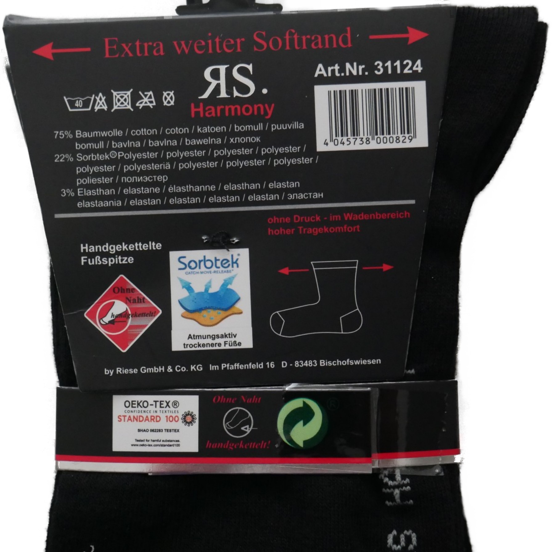 4 Paar RS Harmony Socken in Schwarz für Diabetiker geeignet. Herren Socken in Größe 39-42 43-46 mit extra weitem Softrand ohne Gummi. Die RS Harmony Socken verfügen über einen extra weitem Softrand ohne Druck im Wadenbereich, Ferse und Spitze sind verstärkt, weiche Qualität und eine handgekettelte Fußspitze ohne drückende Naht. Versandkostenfrei innerhalb Deutschlands. Artikelnummer RS31124
