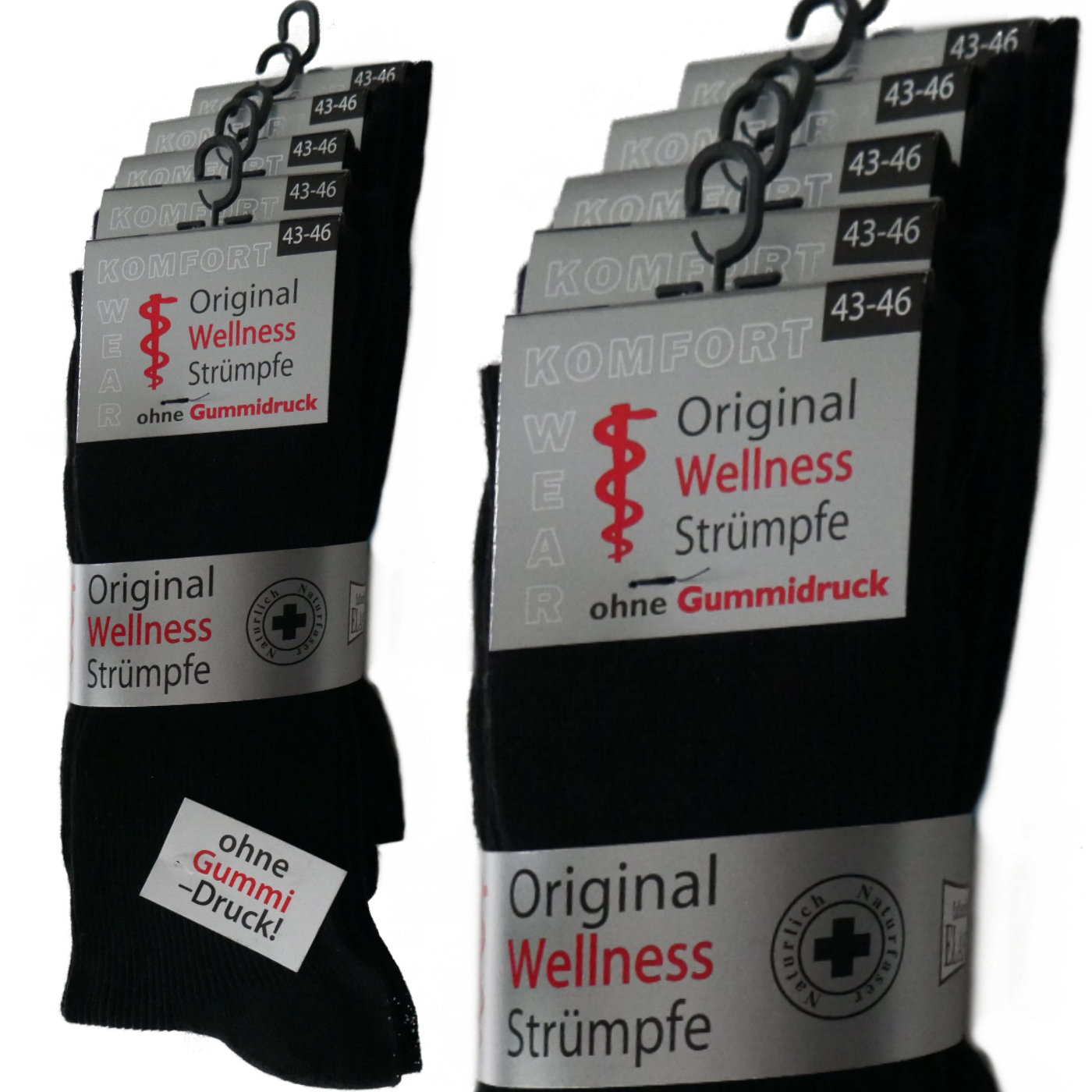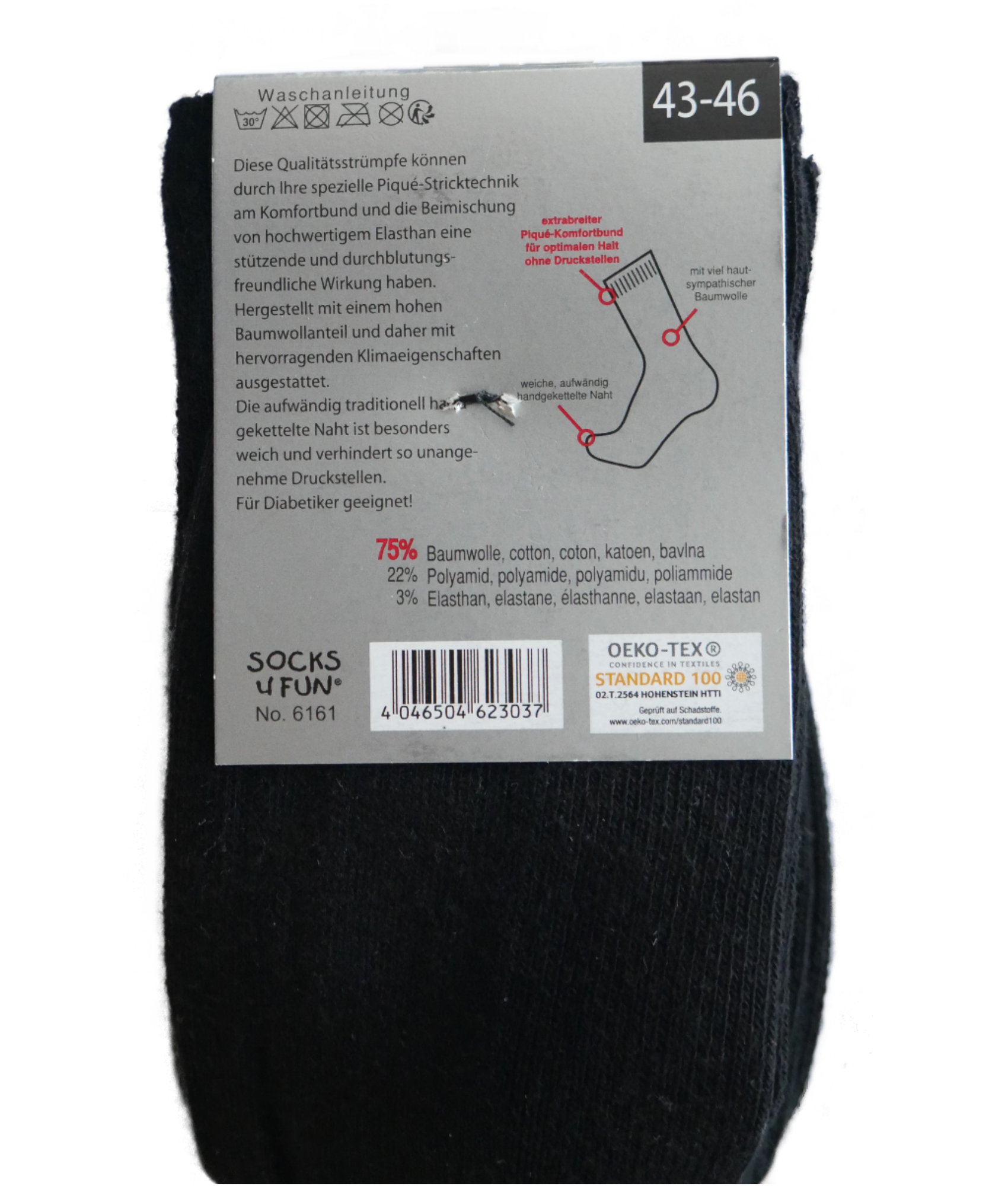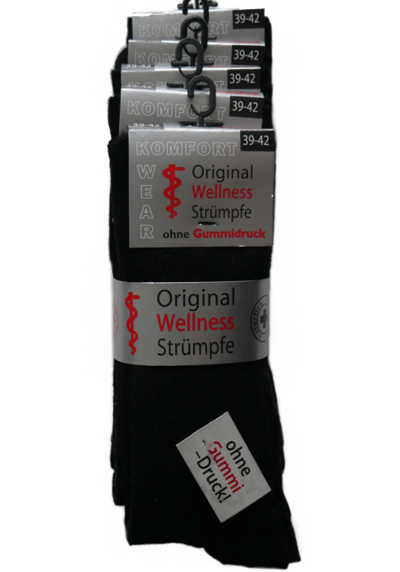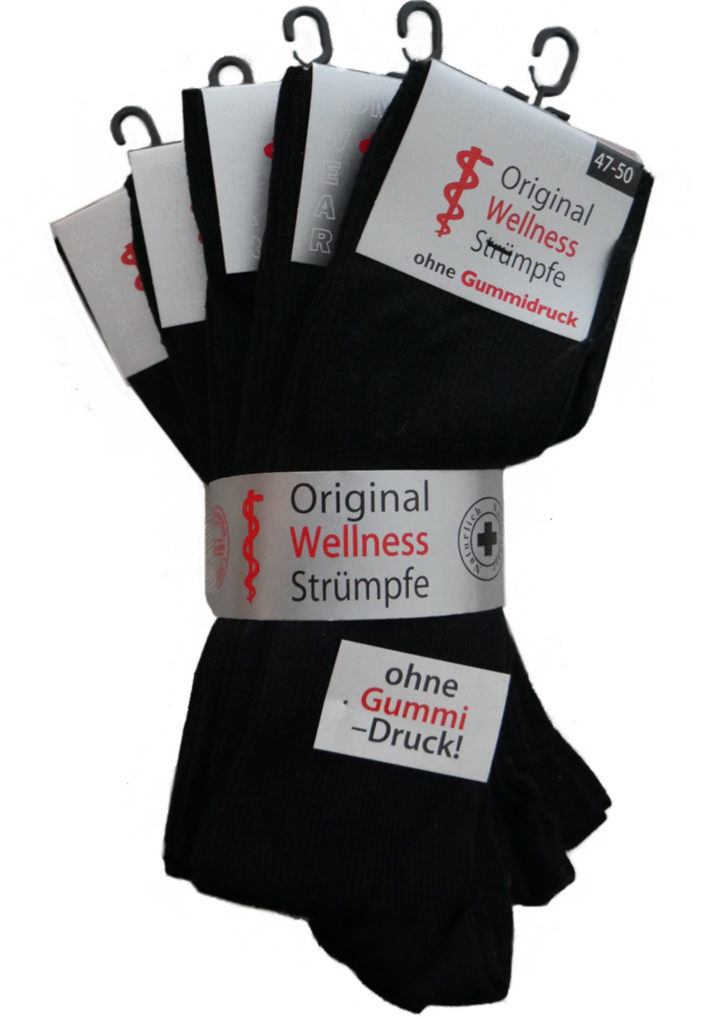 5 Paar Herren-Socken in Schwarz ohne Gummi, wahlweise in Größe 39-42 / 43-46 / 47-50, extrabreiter Bund ohne Gummidruck. Die Wellnesssocken verzichten auf jedes Gummi im Abschlussrand und sind daher besonders empfehlenswert bei Durchblutungsstörungen. Die Beimischung von hochwertigem Elasthan sorgt trotzdem für bestmöglichen Halt, eine optimale Passform und eine stützende Wirkung. Hergestellt mit einem hohen Baumwollanteil und daher mit hervorragenden Klimaeigenschaften ausgestattet. Die aufwändig, traditionell handgekettelte Naht verhindert unangenehme Druckstellen. Versandkostenfrei innerhalb Deutschlands. Artikelnummer WO6161S
